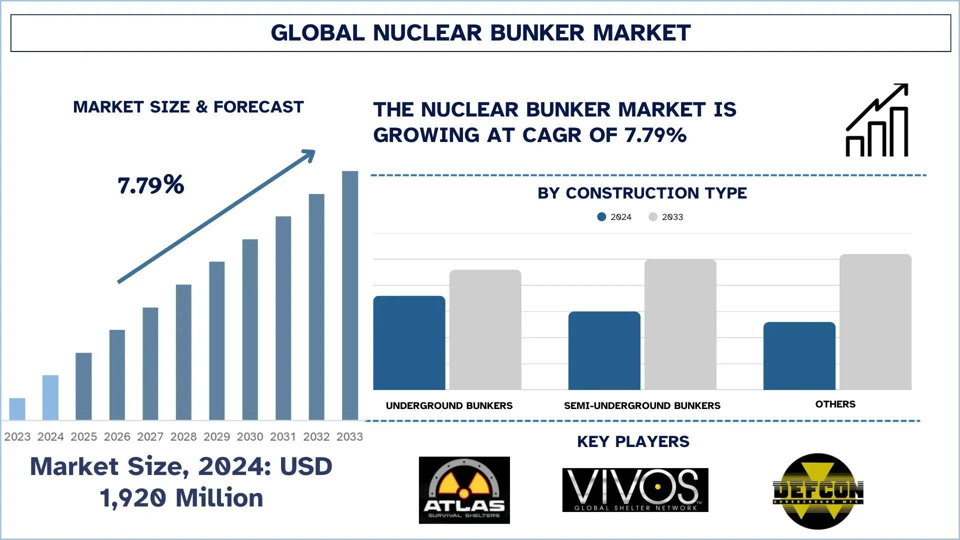 According to a new report by UnivDatos, The Nuclear Bunker Market is expected to reach USD million in 2033 by growing at a CAGR of 7.79%. The nuclear bunker market is growing because of the rise in geopolitical instability, an increase in the perception of nuclear threat, and an increase in the emphasis on national security and civil defense preparedness in various regions. Governments and the military are investing in hardened infrastructure below the earth to provide continuity to operations and security of strategic infrastructure against nuclear, missile, and hybrid attacks. Meanwhile, retrofitting of aging Cold War-era bunkers and shelters is generating a long-term need to upgrade and build new ones. The increased interest of high-net-worth individuals and critical infrastructure operators in disaster resilience has further increased the rate of market growth, as more people become aware of disaster resilience.